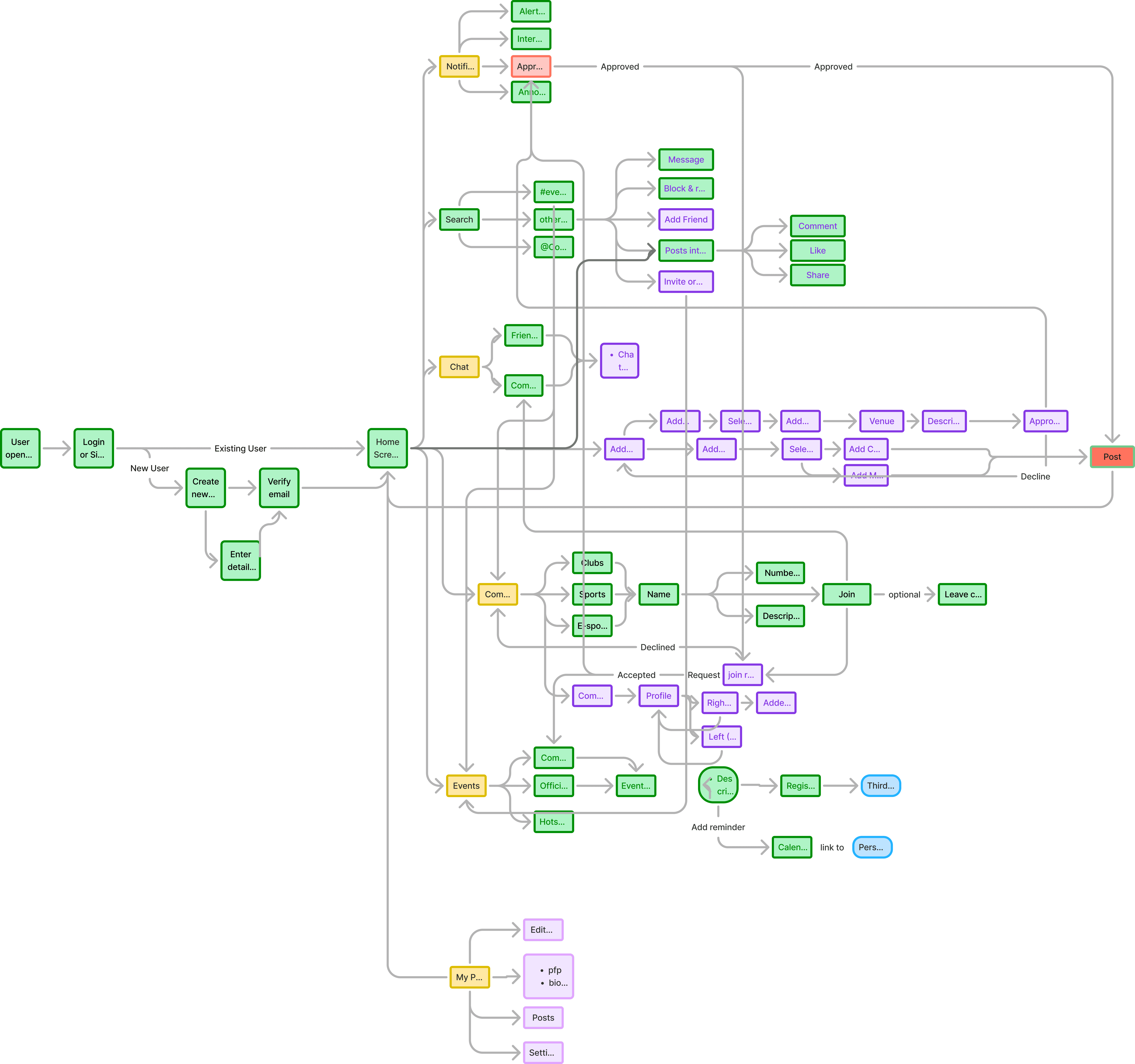 What the userflow revealed Five features sounds simple. Mapping them together exposed how interconnected everything was — events linking to communities, hotspots linking to the feed, onboarding feeding into matching. The architecture had to hold all of it without feeling heavy. Every flow had to end somewhere useful.