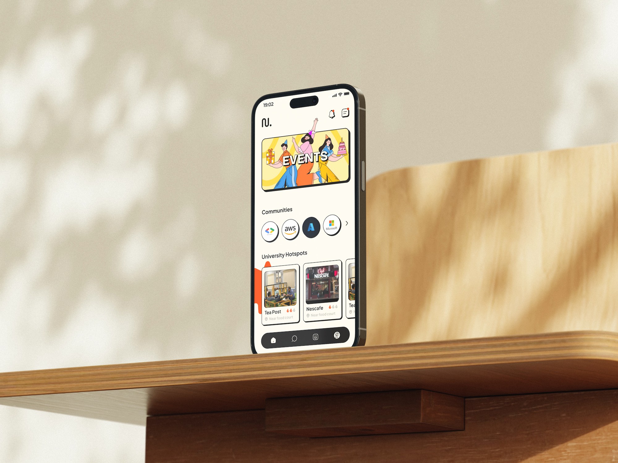 A full campus social platform: events, communities, hotspots, posts and a companion tab Each feature earned its place independently, and together they created a reason to open the app daily The companion tab brought Tinder-style matching into a space where it felt natural, not predatory University-exclusive access meant every person on the app was already in the same building as you
