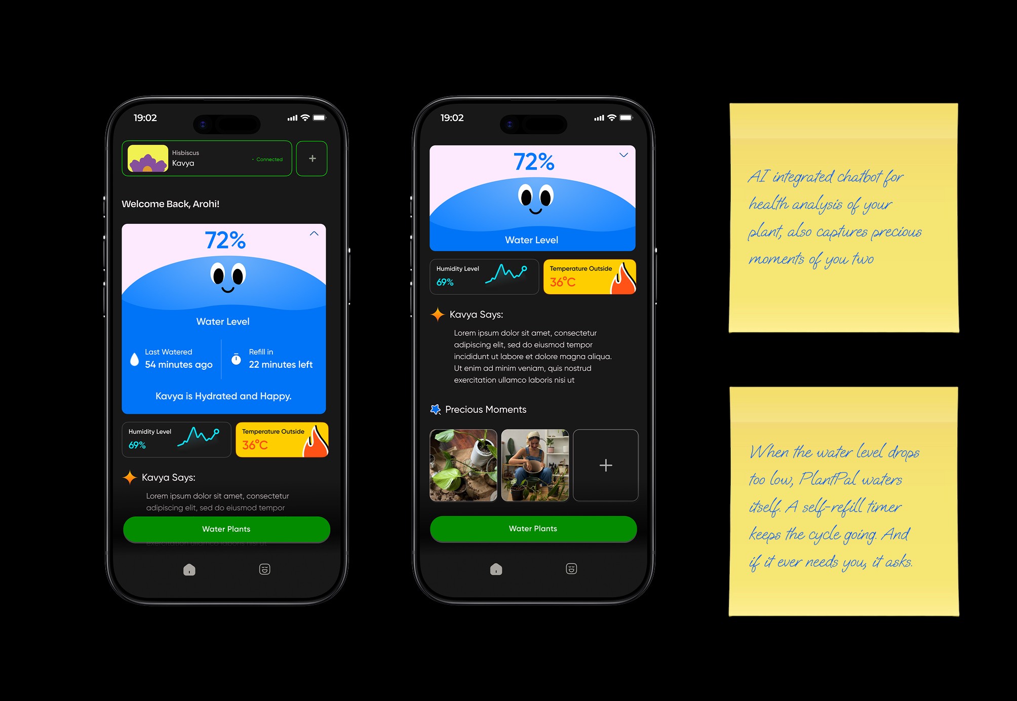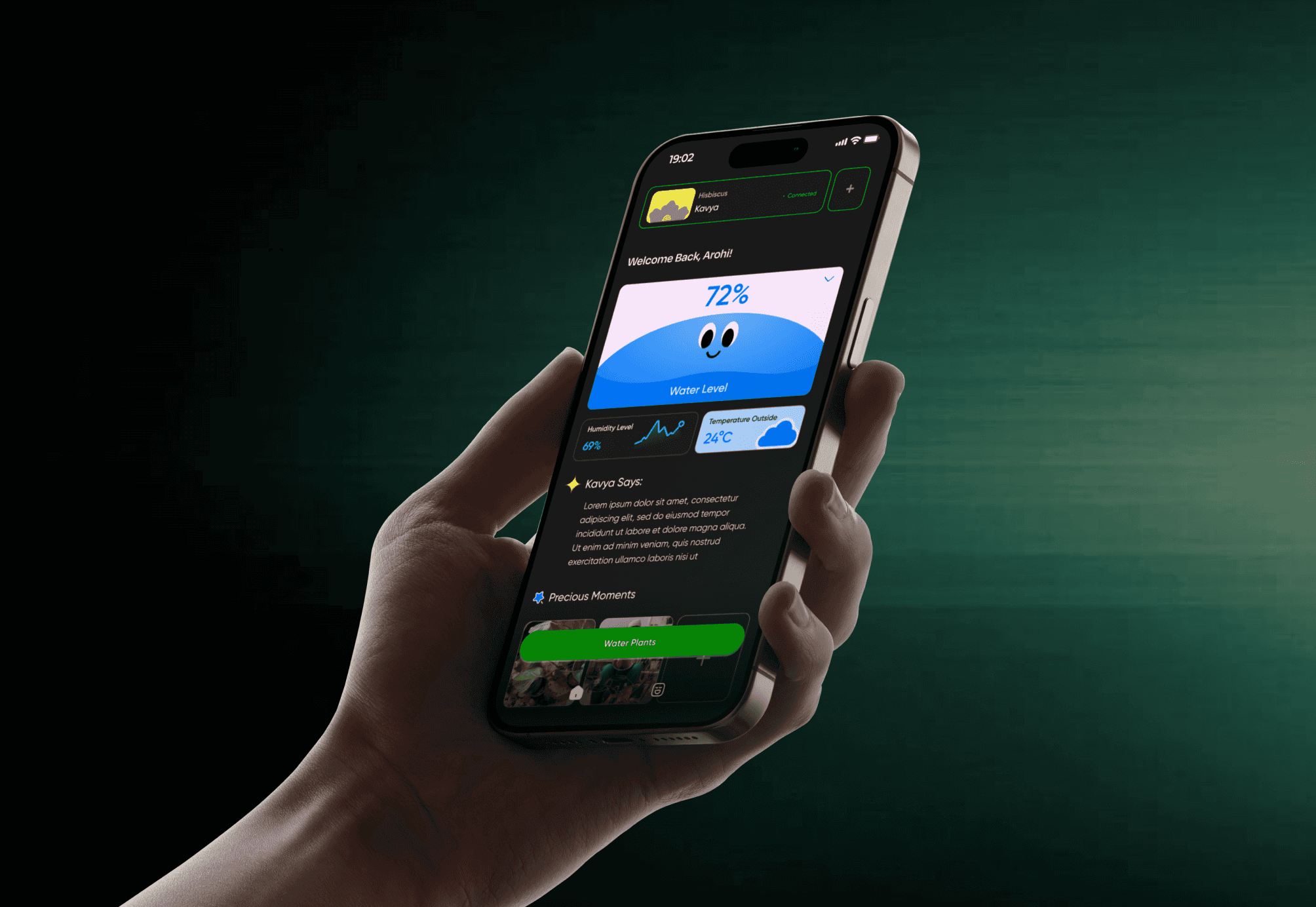 We gave each plant a character, a name, a birthday, and a voice. Kavya Says became the plant's daily check-in. The water level wasn't a percentage buried in settings.